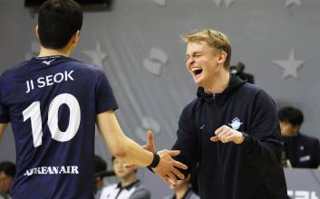 2024-2025 프로배구 V리그 남자부 KB손해보험과 대한항공의 경기가 12일 오후 경기도 의정부시 경민대 체육관에서 열렸다. 4세트 세트포인트에서 정지석이 서브실책을 하자 틸리카이넨 감독이 웃으며 위로하고 있다. 의정부=김민규 기자 mgkim1@edaily.co.kr /2025.01.12/ 2025.01.12 16:08
