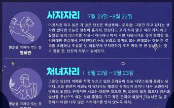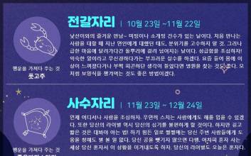 자료제공 : 점신 물병자리 (1.20 ~ 2.18) 몸과 마음이 헤이해지는 하루다. 공부도 하기 싫고, 입맛도 없고, 친구들과의 만남도 시큰둥하다. 마음속에 고민거리가 있지 않은지 곰곰이 생각해보자. 친구들의 도움 보다는 가족의 도움이 필요한 날이다. 특히나 엄마, 자매 등 여성에게 도움을 받게 될 수 있으니 먼저 말을 걸어보는 것도 좋다. 집 보다는 다른 곳에서 이야기하는 것이 더 좋으니 분위기가 어색하다면 자연스럽게 동네 한 바퀴를 산책하자고 하거나 맥주 한 잔, 콜라라도 한 잔 하면서 대화를 시작해보면 어떨까. 행운을 가져다 주는 것 : 핸드로션 물고기자리 (2.19 ~ 3.20) 기본에 충실해야 하는 날! 정석대로 모든 일을 처리해야 뒤탈이 없다. 충분히 생각하지 않은, 섣부른 임기응변은 크게 후회할 일을 만드니 조심하자. 정확하지 않은 소문으로 인해 피해를 볼 수 있으니 오늘 듣는 얘기 대부분 한 귀로 듣고 한 귀로 흘리자. 두 가지 일을 함께 진행하는 일이 있다면 맺고 끊음을 확실히 하자. 괜히 두 마리 토끼를 잡으려다가 공만 들이고 흐지부지 될 수 있다. 행운을 가져다 주는 것 : 뿔테안경 양자리 (3.21 ~ 4.19) 눈치 코치 귀치. 오늘은 빠른 눈치와 순발력이 있어야 살아남는 날이다. 주변 분위기가 요상~하게 돌아갈 일들이 많으니 상황파악 빨리 하고 임기응변 적절히 해야 뒤탈이 없겠다. 괜히 고래싸움에 새우등 터질 수도 있으니 몸 사리자. 여러사람들이 있을 때는 가급적 말도 삼가는 것이 좋겠다. 눈에 잘 띄는 노란색이나 황색 계통의 코디를 하는 것이 오늘 당신의 안전지수를 높여준다. 행운을 가져다 주는 것 : 코미디 황소자리 (4.20 ~ 5.20) 오늘은 지갑의 지퍼와 단추를 단단히 채우자. 차비만 챙겨놓고 지갑을 놓고 나가는 것도 지혜로운 방법이겠다. 어디에 어떻게 썼는지 모르게 돈이 술술 빠져나간다. 보람도 없고 생색도 못내는 돈이니 뒤돌아서면 아깝기만 하다. 오늘 하루 구두쇠 소리 들을 각오 하고 일주일일 편하다면 그게 더 이득 아닐까? 내 생각을 고집하다간 말다툼이 있을 수 있겠으니 조심하자. 그/그녀와도 치사한 말다툼이 있을 수 있으니 주의할 것. 행운을 가져다 주는 것 : 바나나 쌍둥이자리 (5.21 ~ 6.21) 아침에 일어나면~ 세수를 하고! 아침을 먹고! 학교에 가고! 아님 회사에 가고! 언제나 무계획. 흘러가는 대로 살아온 당신~! 오늘 하루만큼은 무슨 일을 할 것인지 철저한 계획을 세워보자. 시간 조절만 잘 한다면 당신이 원하는 만큼의 이득을 얻을 수 있을 것이다. 한가한 오후의 여유로움을 느껴보는 것도 좋을 듯. 오늘 당신의 행운의 장소는 은행. 솔로인 당신은 이상형을 만나거나, 친했던 동창을 만날 수도 있겠다. 행운을 가져다 주는 것 : 동전 게자리 (6.22 ~ 7.22) 남 탓하기보다는 나를 더 살펴봐야 하는 날이다. "가랑잎이 솔잎더러 바스락 거린다"고 한다. 다른 사람의 문제를 지적하기 전에 당신의 문제를 먼저 파악해야 할 것이다. 그것만 잘 한다면 모든 일이 순조롭다. 여기저기서 당신의 능력을 인정받을 것이고 오라는 데도 많을 것이다. 그러니 작은 것에 신경 쓰지 말고 좀 폭 넓게 생각해보는 게 좋을 듯하다. 오늘 당신의 행운의 장소는 별다방 혹은 콩다방 같은 커피숍. 행운을 가져다 주는 것 : 여의도 사자자리 (7.23 ~ 8.22) 이것저것 하고 싶은 게 많은 당신은 욕심쟁이~ 우후훗! 그동안 하고 싶다는 생각만 했다면 오늘은 실천에 옮기자. 안된다고 포기 하지 말고 여러 가지 하고 싶었던 일의 리스트를 작성~! 하나하나 따져 가면 지워나가는 것이 현명한 일. 감정에만 충실해서 선택했다간 돈도 날리고 흥미도 없는 쓸데없는 짓을 한 결과를 초래하니 조심할 것. 아침부터 부지런하게 조조 영화 한 편 감상하는 것도 좋을 듯. 당신의 하루가 길어진다. 행운을 가져다 주는 것 : 영화관 처녀자리 (8.23 ~ 9.23) 그동안 당신의 어깨를 꾹꾹 누르고 있던 문제들이 오늘 자연스럽게 풀리는 날이다. 오늘 완전히 해결되지 않더라도 해결의 실마리가 보이니 너무 고민하지 않아도 되겠다. 권위적인 사고는 마찰만 일으킬 뿐, 도움이 되지 않으니 겸손과 솔선을 우선으로 하는 것이 좋겠다. 크고 작은 문제와 해결의 가능성은 늘 공존하기 마련! 너무 많은 스트레스를 받지 않도록 하자. 행운을 가져다 주는 것 : 운동화 천칭자리 (9.24 ~ 10.22) "가랑잎이 솔잎더러 바스락 거린다"고 했던가~ 다른 사람을 지적하기 전에 당신의 문제를 먼저 파악해야 하는 것이 순서! 계속되는 스트레스에 당신은 언제나 멍~ 이번 기회에 바다로 여행이나 다녀오는게 좋을 날이다. 작은 것, 사소한 것들에 너무 신경쓰지 말고 좀 폭 넓게 생각해보는 여유를 갖는 게 좋을 듯 하다. 자가용 보다는 대중교통을 이용하자. 바다에 가서 한 발자국 물러서서 바라보는 능력도 발휘해보자. 행운을 가져다 주는 것 : 기차표 전갈자리 (10.23 ~ 11.22) 낯선이와의 즐거운 만남~ 미팅이나 소개팅 건수가 있는 날이다. 처음 만나는 사람을 대할 때 지난 연인에게 대했던 태도, 분위기를 고수하지 말 것. 그러나 급한 마음에 달려가다간 돌뿌리에 걸려 넘어지는 날이다. 성급함을 조심하자! 익숙한 일이라고 무신경하다가는 부끄러운 실