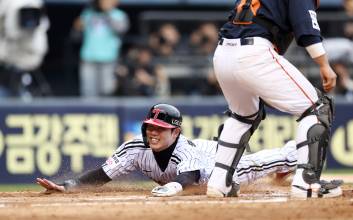 LG 트윈스가 다소 행운이 따른 추가 득점을 올렸다. 홈으로 쇄도하던 주자가 미끄러졌는데, 수비가 이를 보지 못했다. LG가 1점을 더 넉넉하게 달아났다. LG는 26일 서울 잠실야구장에서 열린 한화 이글스와 2025 신한은행 SOL 뱅크 KBO 포스트시즌(PS) KS 1차전에서 6회 4점을 추가해 8-2 리드 중이다. 7번째 득점에서 다소 행운이 따랐다. 2사 1, 2루에서 친 김현수의 타구가 좌익수 앞에 떨어졌다. 2루 주자 홍창기는 3루를 돌아 홈을 향해 달렸고, 한화 좌익수 최인호가 공을 던졌지만 타이밍 상 아웃이었다. 하지만 이 때 홍창기가 미끄러졌다. 이날 오전부터 내린 부슬비에 그라운드가 젖었고, 홍창기가 달리다 미끄러진 것이다. 그런데 이 때 공을 잡은 3루수 노시환이 이를 보지 못했다. 끝까지 달려야 했던 홍창기는 수비 상황도 보지 않고 다시 홈까지 내달렸다. 뒤늦게 홈으로 공을 던졌지만 한참 늦었다. 한화로선 이닝을 마칠 수 있던 상황에서 추가 실점만 했다. 2-7까지 벌어진 상황에서 한화는 문보경에게 추가 적시타를 맞으며 2-8까지 끌려갔다. 한화는 박상원을 내리고 황준서를 투입해 불펜 한 명을 더 소모했다. 이 실점이 승부에 큰 영향을 주는 점수는 아니었다. 하지만 4점 차와 6점 차는 엄연히 다르다. 이제 1차전을 치른 시점에서 불펜 한 명 한 명이 소중한 상황에서 한화는 아쉬운 플레이로 실점과 불펜을 소모해야 했다. 잠실=윤승재 기자 2025.10.26 16:20