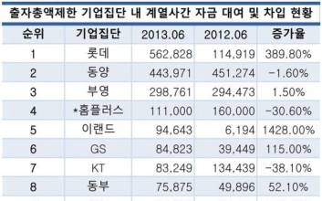 재벌그룹 계열사들이 다른 계열사에서 돈을 빌리는 계열사간 자금 대여 및 차입이 크게 늘어난 것으로 나타났다. 특히 계열사간 차입에 보험, 캐피탈, 대부업체 등 계열 금융회사를 동원한 경우가 많아 재벌 계열 금융사의 사금고화 논란이 일고 있다.27일 기업경영성과 평가 사이트인 CEO스코어가 49개 출자총액제한 기업집단의 올 상반기 계열회사로부터의 자금 차입 현황을 조사한 결과 총 173건에 2조2441억원에 달하는 것으로 나타났다. 이는 지난해 기간 181건, 1조8976억원에 비해 건수는 4.4% 줄었지만 금액은 18.3% 증가한 수치다. 반면 같은 기간 총 차입금은 184조8000억원으로 작년 상반기(205조9279억원)보다 10% 줄었다. 이에 따라 이들 재벌 그룹의 총 차입금 중 계열사 의존도는 작년 0.92%에서 올해는 1.21%로 0.29%포인트 상승했다. 이처럼 계열사 자금 차입이 늘어난 이유에 대해 CEO스코어는 금융기관들이 재벌 계열사라도 재무구조가 좋지 않거나 신용등급이 낮은 기업들에 대한 대출을 엄격히 관리하는 데다, 회사채 발행시장도 얼어붙으면서 계열사에서 돈을 빌려 버티는 경우가 많아지고 있기 때문인 것으로 분석했다. 특히 총 173건의 계열사간 자금 대여 중 36건(20%)은 보험, 캐피탈, 대부업체 등 계열 금융사가 자금을 빌려준 경우여서 사금고화 논란까지 일고 있다.그룹별로는 롯데그룹의 계열사 자금 차입이 10건, 5628억 원으로 가장 많았다. 호텔롯데가 롯데인천개발에 4600억 원을 빌려준 것을 비롯해 계열 금융회사인 롯데캐피탈이 롯데상사와 디시네마오브코리아, 현대정보기술 등에 돈을 빌려줬다. 이에 따라 롯데그룹의 계열사간 차입 의존도는 13.5%로 작년 같은 기간(6.1%) 보다 무려 2배 이상 급증했다.2위는 법정관리를 신청한 동양그룹으로 14건, 4440억원에 달했다. 이중 절반이 훨씬 넘는 9건은 금융계열사인 동양파이낸셜대부 등을 통한 자금 대여였다. 동양파이낸셜대부는 동양레저, 동양인터내셔널, 티와이머니대부, 동양파워 등에 자금을 빌려줬다.3위는 부영으로 총 12건, 2988억원의 계열사간 자금 대여가 이뤄졌다. 동광주택이 부영주택, 부영대부파이낸스, 부영환경산업, 남양개발, 남광건설산업 등에, 부영주택도 부영CC와 부영 등에 돈을 각각 빌려줬다.홈플러스는 홈플러스테스코에 총 1110억 원을 빌려줘 단번에 4위로 뛰어 올랐다.5위는 946억 원을 기록한 이랜드. 이랜드는 이랜드월드와 이랜드리테일, 이랜드건설이 이랜드파크에, 이랜드파크가 이랜드크루즈와 돔아트홀, 투어몰에 돈을 빌려주는 등 복잡한 자금거래가 11건이나 발생했다.6~10위는 GS, KT, 동부, STX, 포스코가↑ 나란히 이름을 올렸다.GS는 주로 코스모 계열사간 자금 거래가 많았다. 코스모화학, 코스모글로벌, 코스모앤컴퍼니, 코스모산업, 마루망코리아 등이 자금 주고 받았다. 이외에 GS에너지와 GS건설도 각각 3개와 2개 계열사에 자금을 빌려줬다. 총 17건에 848억 원 규모다.KT는 11건 832억 원으로, 자금 대여는 주로 금융사인 KT캐피탈을 통해 이뤄졌다. 이니텍스마트로홀딩스, KT링커스, 스마트로, KT텔레캅, KT오아이씨 등이 KT캐피탈로부터 돈을 빌렸다.동부는 대여금이 759억으로 8위였지만 건수는 22건으로 가장 많았다. 동부생명과 동부화재가 동부하이텍에 대여한 것을 비롯해 동부건설, 동부팜한농을 중심으로 자금 대여 및 차입이 집중적으로 일어났다.반면 삼성과 현대차그룹은 계열사 차입금이 미미한 수준이었으며 SK, LG, 현대중공업, 한화, 두산, 신세계, 현대, 금호아시아나, 대림, 에쓰오일, 영풍, 코오롱, 한진중공업, 태광, 교보생명보험, 하이트진로, 태영 등 17개 그룹은 올 상반기 계열사간 자금 대여가 전혀 없었다.이형구 기자 ninelee@joongang.co.kr