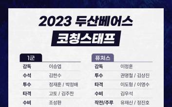 두산 베어스가 2023시즌 코칭스태프 보직을 최종 확정했다.두산은 13일 2023시즌 1군과 2군 코칭스태프를 확정했다고 발표했다.1군은 신임 이승엽 감독을 필두로 이승엽 감독의 삼성 라이온즈 시절 선배 김한수 수석코치가 호흡을 맞춘다. 투수 파트는 프랜차이즈 스타 정재훈 코치와 함께 역시 두산 출신인 박정배 코치가 함께 맡았다. 타격 파트는 2018년 두산을 리그 최강 타선으로 이끌었던 고토 고지 코치와 김주찬 코치가 담당하기로 했다.수비 파트는 지난해까지 한화 이글스에 있었던 조성환 코치가 담당한다. 조 코치 역시 두산에 몸을 담았던 경력직이다. 2018년부터 2020년까지 수비 파트를 맡았던 그가 2년 만에 다시 돌아오게 됐다.이밖에 정수성 작전코치(3루), 고영민 주루코치(1루), 세리자와 유지 배터리코치, 천종민·조광희·유종수 트레이닝코치가 1군 코칭스태프를 맡게 됐다.퓨처스 팀은 베테랑 이정훈 감독이 지휘봉을 잡는다. 투수 파트는 프랜차이즈 스타였던 권명철·김상진 투수 코치가 담당한다. 타격 파트는 이도형·이영수 코치가, 수비 파트는 김우석 코치가 맡았다. 이밖에 유재신·정진호 작전/주루코치, 조경택·김진수 배터리코치, 이광우 트레이닝 코치가 유망주 육성에 나선다. 재활·잔류군은 강석천 코치가 담당한다.차승윤 기자 chasy99@edaily.co.kr