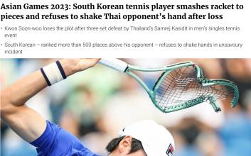 테니스 간판 권순우(세계랭킹 112위·당진시청)가 아시안게임 무대에서 논란의 중심에 섰다. 세계랭킹이 한참 낮은 상대에게 충격패를 당한 뒤 평정심을 잃은 건데, 라켓을 수차례 내리치며 부순 뒤 상대와 악수까지 거부했다. 외신들의 보도도 이어지고 있는데, 권순우의 왼쪽 가슴엔 태극기가 새겨져 있었다.권순우는 지난 25일(한국시간) 중국 저장성 항저우 올림픽 스포츠센터에서 열린 2022 항저우 아시안게임 남자테니스 단식 2회전에서 태국의 카시디트 삼레즈(636위·태국)에게 1-2(3-6, 7-5, 4-6)로 졌다. 자신보다 세계랭킹이 무려 524계단 낮은 상대에게 2회전에서 충격패를 당한 것이다.남자 단식 4번 시드를 받아 1회전을 부전승으로 통과한 그는 4강에서 톱시드 장즈전(60위·중국)을 만날 것이란 전망이 나오는 등 토너먼트 상위 진출에 대한 기대감이 컸다. 그러나 2회전 문턱을 넘지 못한 채 허망하게 탈락했다.문제는 패배 직후 행동이었다. 권순우는 마지막 두 번의 서브를 제대로 받아내지 못한 뒤 패배가 확정되자, 테니스 라켓을 연이어 코트 바닥으로 내리쳤다. 분이 풀리지 않았는지 그는 의자에도 수차례 라켓을 내리쳤다. 권순우의 이같은 행동은 소셜미디어(SNS)와 유튜브 등을 통해 고스란히 전 세계에 전해졌다.심지어 권순우는 경기 후 악수를 하기 위해 다가온 삼레즈도 외면했다. 주심과 악수도 하지 않고 그대로 짐을 챙겨 경기장을 빠져나갔다. 관중석에선 권순우의 행동을 향한 야유가 울려 퍼졌다.테니스 경기 패배 후 테니스 라켓을 내리치며 화를 표출하는 장면은 종종 있는 일이지만, 이날 권순우처럼 폭력적으로 보일 만큼 수차례 내리치는 건 흔치 않은 일이었다. 더구나 상대의 악수 요청마저 거부하면서 경기도 지고, 매너도 졌다는 비판은 불가피했다.