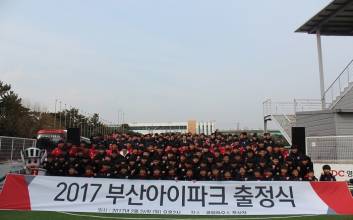 2017년 부산 아이파크의 출항을 알리는 ‘2017 부산 아이파크 출정식’이 성공적으로 막을 내렸다. 28일 오후 2시 강서구에 위치한 클럽하우스에서 팬들과 함께하는 출정식이 열렸다. 이번 출정식에는 작년과 같이 프로 선수들뿐만 아니라 대회 참가중인 유스 U-10을 제외, U-12, U-15(낙동중학교), U-18 선수단이 모두 함께해 올 시즌의 각오를 다지는 자리가 됐다. 이날 행사에는 특별히 시즌회원들을 초대해 선수들과의 스킨십 기회를 늘리고, 비 시즌 내내 새로운 시즌이 시작하기만을 기다렸던 팬들의 갈증을 풀어줬다. 유스 선수들의 학부모 또한 행사에 참석해 자랑스러운 아들의 모습을 바라보며 한 마음 한 뜻이 되는 자리가 되었다. 출정식 행사의 시작을 알린 최만희 대표이사는 “10년 전 부산에서 부단장으로 있을 때 FA컵 우승을 이뤄냈던 것처럼 여기 모인 모든 분들의 마음이 합쳐진다면 우리의 목표를 이룰 수 있다. 앞으로도 계속해서 많은 관심과 응원 부탁 드린다”는 출사표를 던졌다. 부산광역시 체육진흥과 이상길 과장과 체육시설관리사업소 김유창 사업소장도 참석해 자리를 빛냈다. 먼저 유스 선수들의 이름을 한 명 한 명 호명하며 무대에 오르자 미래의 우리 선수들에게 많은 박수 갈채가 쏟아졌다. 프로 선수단을 호명할 때는 모든 참석자들이 양쪽으로 도열해 하이파이브를 하며 선수들을 반겼다. 가장 큰 함성과 박수는 조진호 감독에게 돌아갔다.조진호 감독은 “부산 시민들이 직접 경기장에 찾아와 주셔야 우리 선수들에게 힘이 나고 또 좋은 성적으로 이어질 수 있다”며 많은 응원을 부탁했다. 이어 팬들과 처음 만난 신입 선수들과 외국인 선수들의 인터뷰도 따로 진행됐다. 주장 박준태가 마이크를 들자 중저음의 목소리에 여성팬들이 더 큰 환호를 보내기도 했다. 특이하게 외국인 선수들의 인터뷰 때는 호물로-모라이스-루키안으로 이루어진 브라질 3인방과 통역사, 그리고 야스다와 ‘자칭 일본 통역’ 차영환이 함께 무대에 서 웃음을 자아냈다.이 날의 하이라이트는 신인 선수들의 장기자랑이었다. 김정호-김문환-이동준은 크레용팝의 꾸리스마스 음악에 맞춰 귀여운 율동으로 가장 큰 박수갈채를 받았다. 특히 작년에는 U-18 소속으로 무대 앞에서 형들의 신고식을 지켜봤던 김정호는 “형들에게 뒤지지 않으려고 준비를 많이 했다. 이왕에 할거면 제대로 하는 것이 좋다고 생각했다”며 쑥쓰러움을 애써 감췄다. 공식 출정식 행사가 끝난 뒤엔 바비큐 파티가 마련됐다. 선수, 팬, 학부모가 구분 없이 옹기종기 모여 앉아 구단에서 준비한 돼지고기 바비큐와 어묵탕을 먹으며 담소를 나눴다. 클럽하우스 풋살장 한켠에서는 자연스럽게 호물로와 U-12 선수들이 축구공을 가지고 놀며 실력을 발휘했고, 선수들과 테이블 사커, 다트 게임, 버블 슈팅을 즐기며 행복한 한 때를 보냈다. 출정식 행사를 마친 부산 선수단은 3월 4일 성남FC의 일전을 위해 1주일간의 최종 훈련에 돌입한다. 성남 원정에 함께 해 선수들에게 힘을 쏟을 팬들은 3일 오전 12시까지 부산 홈페이지(www.busanipark.com)에서 진행되는 무료 원정버스 신청을 하면 된다.최용재 기자