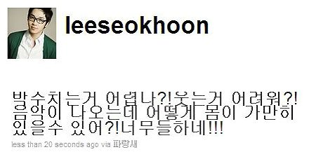 이석훈은 지난 29일 자신의 트위터에 '박수치는거 어렵나? 웃는 것이 어려워? 음악이 나오는에 어떻게 몸이 가많이 있을 수 있어? 너무들 하네'라는 글을 남겼다. 대상을 밝힌 것은 아니지만 이석훈이 트위터에 글을 올린 시간을 고려해봤을 때 29일 열렸던 대종상영화제에서 초대가수로 등장한 소녀시대의 무대를 보고 무반응을 보인 배우들의 태도를 지적한 것으로 추측된다.
