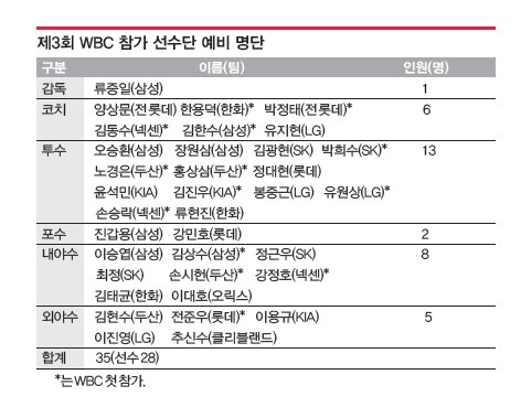 내년 3월 월드베이스볼클래식(WBC)에 참가하는 대표팀 선수 28명의 예비 명단이 추려졌다. WBC 사령탑을 맡은 류중일(49) 삼성 감독과 김인식(65) 위원장 등 한국야구위원회(KBO) 기술위원회는 아시아시리즈 기간 예비 엔트리에 대한 합의를 마치고 12일 KBO를 통해 이를 발표했다. 최종 명단(28명)은 11월30일 확정해 대회 주최측인 WBCI에 통보하지만 부상 선수는 추후 교체가 가능하다. JTBC는 15일 예선라운드 경기를 시작으로 이 대회를 독점 중계한다.
