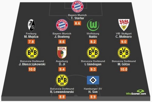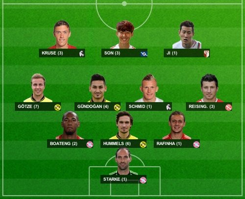 또 손흥민과 지동원은 영국 축구 통계기록 사이트 후스코어드닷컴이 4-4-2 포메이션을 기준으로 선정한 베스트11에도 나란히 이름을 올렸다. 손흥민은 평점 8.9점을 받아 레반도프스키(도르트문트)와 함께 투톱으로 뽑혔다. 지동원은 평점 9.4점을 받아 도르트문트 트리오인 브와슈치코프스키, 권도간, 괴체와 함께 중앙 미드필더로 뽑혔다.