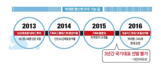 박태환과 대한체육회는 리우 올림픽 출전 여부를 두고 지난한 줄다리기를 하고 있다. 박태환은 이미 지난 5월 국제스포츠중재재판소(CAS)에 이 문제를 놓고 중재를 요청한 상태다. 박태환 측은 "'금지약물을 복용 또는 사용하는 행위로 징계 처분을 받고 징계가 만료 된 날로부터 3년이 경과하지 아니한 자는 국가대표가 될 수 없다' 는 대한체육회의 규정이 '이중징계'에 해당한다"며 CAS에 제소했다.
