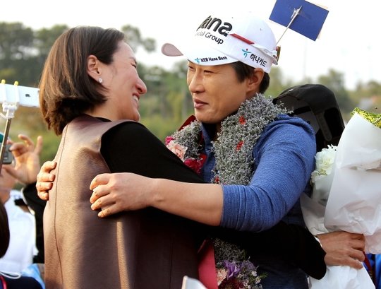 박세리가 13일 1라운드 경기를 마친 뒤 `영원한 골프스승`이자 아버지 박준철씨와 18번홀 그린 주변에서 긴 포옹을 하고 있다. 그는 "아버지는 내 심장 같은 분이다"고 말했다. KEB하나은행 챔피언십 대회본부 제공
