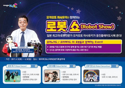 웅진플레이도시 실내 워터파크에서 펼쳐지는 '로봇쇼'는 어린이들의 눈높이에 맞춘 공연과 체험을 풍성하게 제공하고자 일본의 로봇 전문가이자 로봇유원지(일본) 대표인 오카모토 마사유키(MASAYUKI OKAMOTO)를 직접 초청하여 풍성한 로봇 이벤트를 마련할 계획이다.