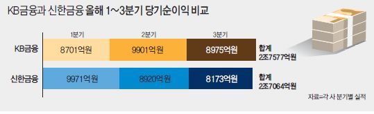 KB금융이 '리딩뱅크' 굳히기에 들어갔다. 분기별 실적으로 지난 2분기에 이어 3분기에도 신한금융을 제쳤다. 분기 누적 실적으로는 처음으로 신한금융을 눌렀다. 증권과 손해보험사 등을 새롭게 계열사로 들이며 몸집을 불린 것이 주된 요인이었다. 2009년 이후 8년간 리딩뱅크 자리를 지켰던 신한금융에는 경고등이 켜졌다.