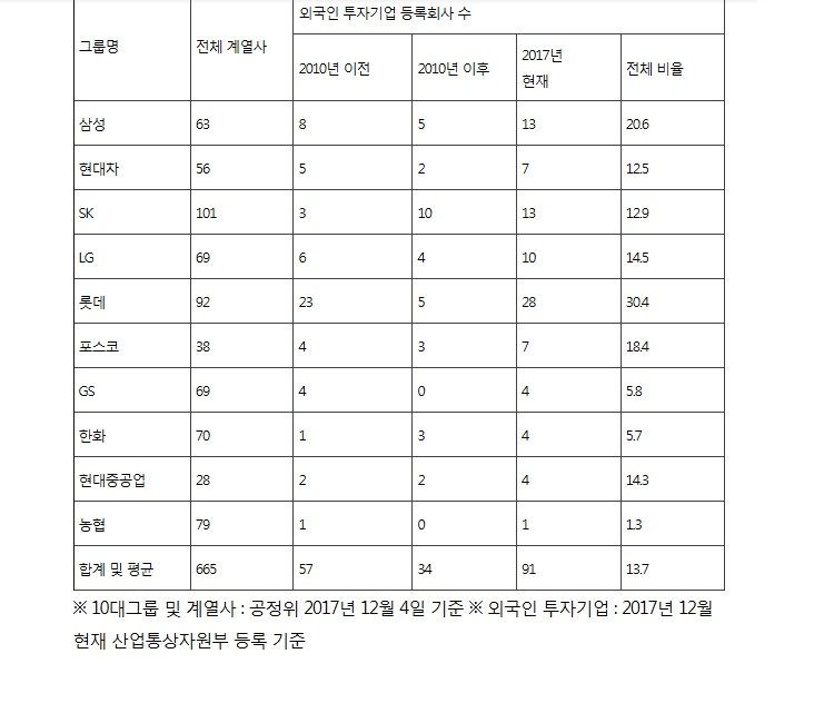 외국인이나 외국 법인이 투자한 '외국인 투자기업'이 국내 10대 그룹 계열사 10곳 중 1곳에 달하는 것으로 나타났다. 이들 기업은 조세특례제한법상 각종 조세감면 혜택을 받을 수 있기 때문에 꾸준한 증가 추세에 따른 조치가 필요하다는 목소리가 나오고 있다. 재벌닷컴이 18일 11월 말 기준 10대 그룹 소속 계열사 665개사를 대상으로 조사한 결과 산업통상자원부에 외국인 투자기업으로 등록된 회사는 91개사로 전체 계열사의 13.7%인 것으로 집계됐다. 10대 그룹의 외국인 투자기업 계열사는 2010년 이전 57개사에 불과했지만 최근 7년 동안 34개사가 더 늘어났다. 외국인 투자기업은 외국인투자촉진법을 적용받아 외국인이나 외국 법인이 주식 10% 이상을 취득해야 등록할 수 있다. 이들은 조세특례제한법상 법인세 외에도 소득세, 부가가치세 등 각종 조세감면 혜택을 받을 수 있고 국가가 국유재산을 수의계약으로 임대나 매각할 수 있는 등 혜택을 받는다. 그룹별 외국인 투자기업은 롯데그룹이 계열사 3곳 중 1곳으로 가장 많았다. 롯데그룹은 전체 92개 계열사 중 외국인 투자기업으로 등록된 회사가 30.8%인 28개에 달한다. 호텔롯데를 비롯한 롯데케미칼, 롯데정보통신, 롯데물산 등 기업들이 외국인 투자기업으로 분류된다. 일본에서 사업하던 신격호 총괄회장이 국내에 진출했기 때문으로 풀이된다. 삼성그룹도 호텔신라, 제일기획, 에스원 등 13개사가 외국인 투자기업으로 등록됐다. SK그룹의 SK텔링크, SK에어가스, SK쇼와덴코 등 13개사도 외국인 투자기업이다. LG그룹이 코카콜라음료, 지투알, 루셈 등 10개사, 현대차그룹은 현대글로비스, 이노션, 현대카드, 현대로템 등 7개사, 포스코그룹은 포스코건설, 포스코터미널 등 7개사에 각각 이른다. GS그룹, 한화그룹, 현대중공업그룹이 각각 4개사였다. 외국인 투자기업으로 등록한 기업에 투자한 국가로는 롯데에 주로 많은 일본이 44개사로 가장 많았고, 미국 11개사, 네덜란드 6개사 등의 순서였다.