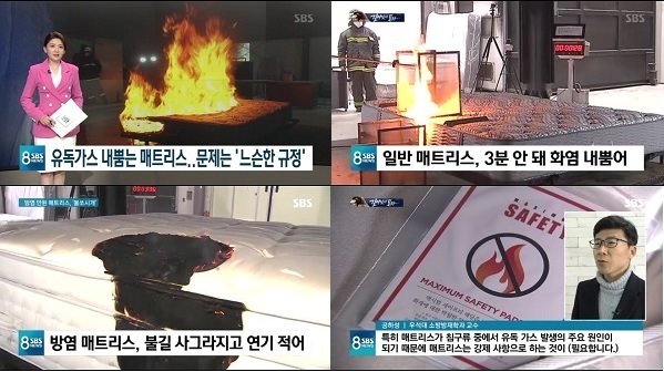 SBS 뉴스화면 캡처 침대 매트리스가 화재 시 인명피해의 주된 원인이 되지만 관련 규정이 전혀 없는 것으로 밝혀져 논란이 일고 있다.