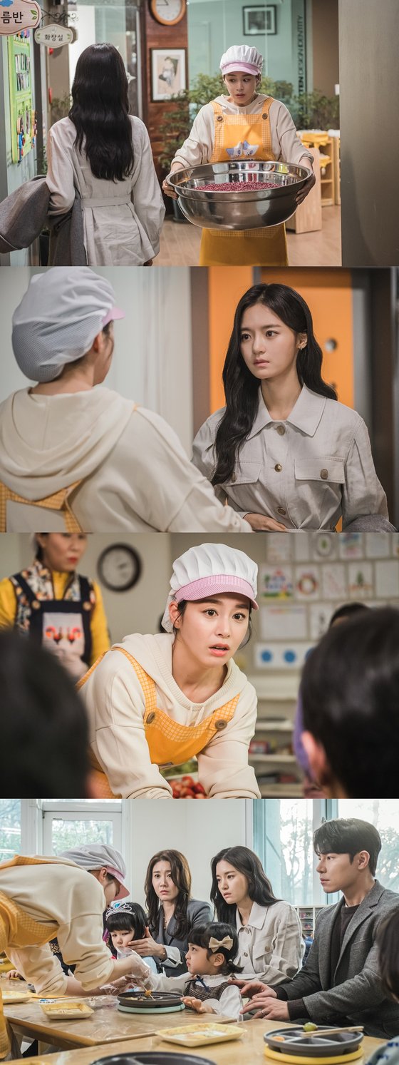 사진 속 김태희·이규형·고보결의 아슬아슬한 삼자대면이 흥미진진하다. 이규형과 고보결은 유치원 학부모 참관 수업을 하러 서우진이 다니는 어린이집에 찾아갔다. 눈치를 살피며 지나가던 김태희를 불러 세운 고보결의 눈빛이 의미심장하다. 위생 모자를 눌러쓴 김태희는 최대한 부딪치지 않으려 애쓰지만 피할 수 없는 고보결의 시선은 김태희를 향해 올곧게 뻗어왔다. 이어진 사진 속 이규형·고보결·서우진이 나란히 앉아 있는 자리에 무언가를 건네는 김태희의 모습도 흥미롭다. 이때 이규형은 당황스러운 표정을 숨기지 못했다.