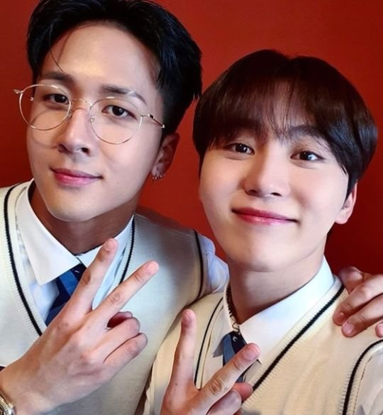 공개된 사진 속 라비는 세븐틴 부승관과 함께 '아는 형님' 대기실에서 셀카를 남기는 모습. 교복을 착용한 채 미소 짓는 두 사람의 훈훈한 비주얼이 눈길을 사로잡는다.
