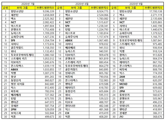 2020년 9월 보이그룹 브랜드 평판 통계표 / 사진=한국기업평판연구소 2020년 7월~9월 보이그룹 브랜드 평판 순위 / 사진=한국기업평판연구소 1위, 방탄소년단 ( RM, 슈가, 진, 제이홉, 지민, 뷔, 정국 ) 브랜드는 참여지수 3,764,112 미디어지수 5,337,856 소통지수 4,445,056 커뮤니티지수 4,153,114가 되면서 브랜드평판지수 17,700,138로 분석되었다. 지난 8월 브랜드평판지수 8,924,775와 비교하면 98.33% 상승했다.