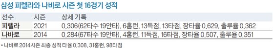 첫 16경기 기준 2014년 나바로(오른쪽)보다 앞선 성적을 기록하고 있는 피렐라. 삼성 제공 '첫 16경기' 기준으로는 나바로보다 더 낫다. 나바로는 2014년 첫 16경기에서 타율 0.284(67타수 19안타), 4홈런, 11득점, 16타점을 기록했다. 출루율과 장타율은 각각 0.351, 0.507였다. 타점을 제외한 대부분의 공격 지표에서 피렐라가 한발 앞선다. 나바로는 첫 시즌을 타율 0.308, 31홈런, 98타점으로 마쳤다. 2014년은 팀당 128경기로 치러져 현행 144경기보다 16경기가 적었다. 피렐라가 거둘 성적에 대한 기대감이 더 커진다. 특히 피렐라는 태도 논란에 휩싸였던 나바로와 달리 성실한 자세로 팀에 녹아들고 있다.