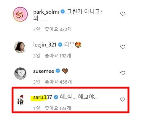 그 와중에 개그우먼 송은이는 지난 24일 "혜... 혜... 혜교야"라는 망설이는 듯한 댓글을 남겨 웃음을 자아냈다.