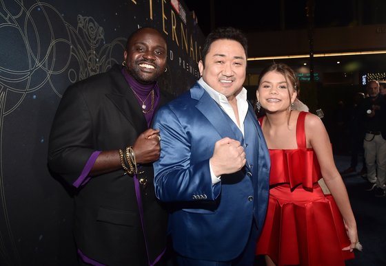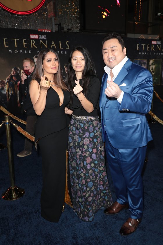 특히 마동석은 특유의 자신감 넘치는 모습으로 뜨거운 환호를 받았다. 마동석은 클로이 자오 감독과 에이잭 역을 맡은 셀마 헤이엑과 K하트를 함께 하는 모습이 포착돼 더욱 눈길을 끌었다.