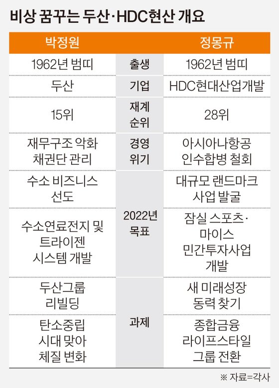 박정원 두산그룹 회장. 두산그룹과 HDC현대산업그룹(이하 HDC현산)이 처절했던 경영 위기를 딛고 도약을 벼르고 있다. 수장인 박정원 두산 회장과 정몽규 HDC현산 회장이 나란히 1962년생 호랑이띠여서 비범한 기운을 발판 삼아 새로운 전환점을 마련할 수 있을지 관심이 쏠린다.