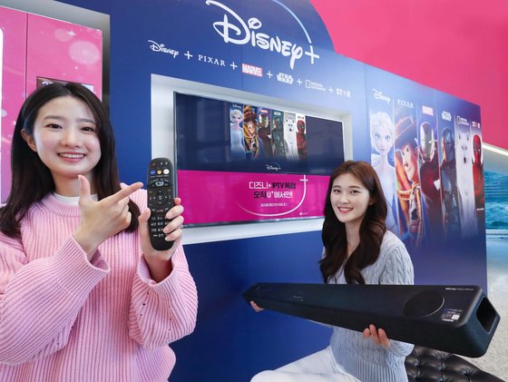 모델들이 '디즈니 플러스' IPTV 서비스를 소개하고 있다. LG유플러스 제공