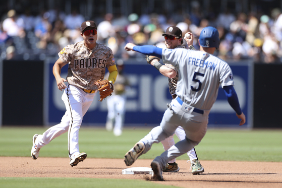 김하성(왼쪽)이 12일(한국시간) 샌디에이고 펫코파크에서 열린 LA 다저스와 샌디에이고 파드리스의 경기에서 4회 초 수비 상황에서 2루 베이스를 향해 뛰고 있다. AP=연합뉴스 김하성(27·샌디에이고 파드리스)이 LA 다저스와 라이벌 매치에서 3경기 연속 무안타로 침묵했다. 반면 샌디에이고 상대 절대 강세를 이어간 다저스는 10년 연속 포스트시즌 진출을 확정했다.