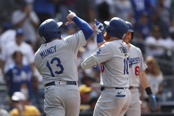 LA 다저스 3루수 저스틴 터너(오른쪽)가 12일(한국시간) 샌디에이고 펫코파크에서 열린 원정 경기에서 7회 초 만루 홈런을 친 후 맥스 먼시와 세리머니를 나누고 있다. AP=연합뉴스 이날 승리로 다저스는 '슈퍼 팀'다운 페이스를 이어갔다. 12일 기준 다저스의 득점과 실점 차이는 +310점으로 MLB 전체 독보적인 1위를 기록 중이다. 11일 샌디에이고 전에서 올 시즌 처음으로 +300점을 넘었고, 바로 9점을 추가하며 역대급페이스를 이어갔다. 2위 뉴욕 양키스(+206점)와는 104점이나 벌어져 있다. MLB 역사상 득실점 차 300점 이상을 기록한 건 2001년 시애틀 매리너스가 마지막이다. 당시 +300점을 기록한 시애틀은 정규시즌 116승을 거두며 162경기 체제 이후 가장 많은 승수를 달성했다.