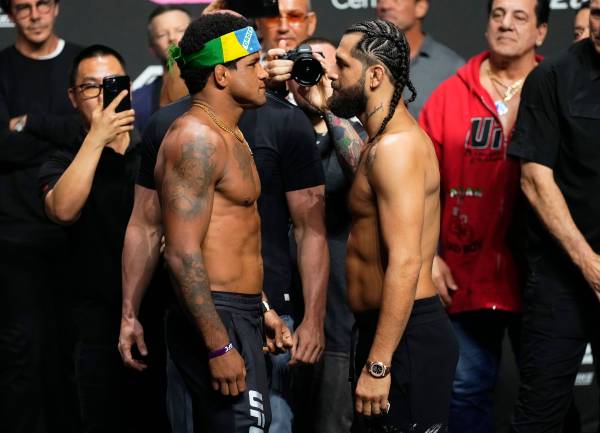 페레이라의 각오도 만만치 않았다. 브라질 파탁소 원주민 전통 분장을 한 페레이라는 “내가 할 말은 내일 그의 개 목줄을 벗긴 다음에 개처럼 두들겨 패겠다는 것뿐이다”라고 받아쳤다. 길버트 번즈(왼쪽)와 호르헤 마스비달.(사진=UFC) 코메인 이벤트에 나서는 웰터급 랭킹 5위 길버트 번즈(36∙브라질)와 11위 호르헤 마스비달(38∙미국)도 무사히 계체에 통과했다.