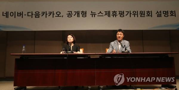 2015년 5월 28일 서울 중구 태평로 한국프레스센터에서 열린 '네이버-다음카카오, 공개형 뉴스제휴평가위원회 설명회' 모습. 임선영 다음카카오 이사(왼쪽)와 유봉석 네이버 이사가 취재진의 질문에 답하고 있다. 연합뉴스 네이버와 카카오의 뉴스제휴평가위원회가 활동을 잠정 중단한다.