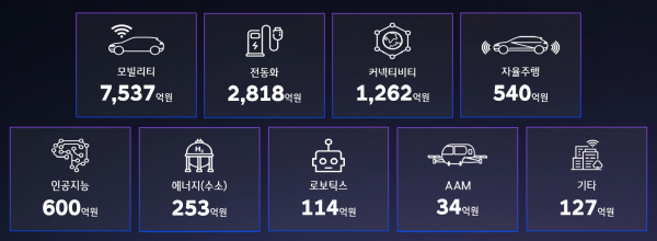세부적으로는 모빌리티 분야 투자액이 7537억원으로 가장 많았고 이어 전동화(2818억원), 커넥티비티(1262억원), 인공지능(600억원), 자율주행(540억원), 에너지(253억원) 등이었다.