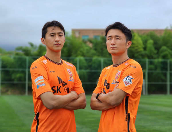 18일 제주 유나이티드에 합류한 김건웅(왼쪽)과 임창우. 사진=제주 제공 베테랑 수비수 임창우는 2010년 울산 현대에서 프로 데뷔했으며, 대전 시티즌(임대) 알 와흐다 FC(아랍에미리트) 강원FC에서 꾸준한 활약을 펼쳤다. K리그 통산 성적은 141경기 6골 4도움.