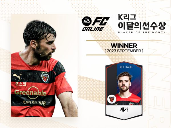포항 공격수 제카가 K리그 공식 비디오게임 파트너 일렉트로닉아츠(Electronic Arts, 이하 'EA')가 후원하는 9월 'EA SPORTS K리그 이달의 선수상(EA SPORTS K LEAGUE Player Of The Month)'을 수상했다.