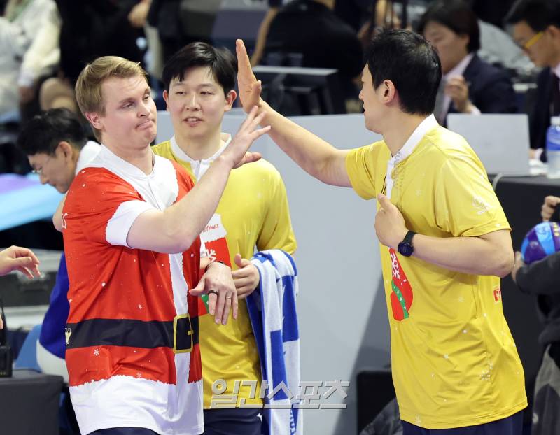 [IS 승장] '산타 복장 지휘' 틸리카이넨 감독 "배구팬 웃었다면 성공적"