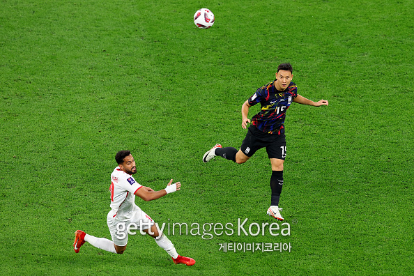 7일 아흐마드 빈 알리 스타디움에서 열린 2023 AFC 아시안컵 4강전 한국과 요르단의 경기. 정승현(오른쪽)이 알타마리와 경합을 벌이고 있다. 사진=게티이미지