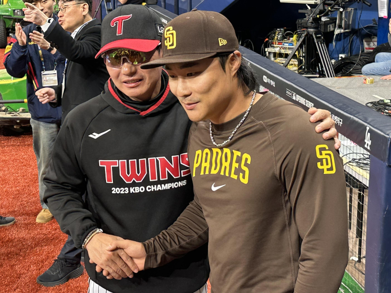 염경엽 LG 감독(왼쪽)과 샌디에이고 김하성이 18일 서울시 구로구 고척 스카이돔에서 만나 대화하고 있다. 사진=연합뉴스 정규시즌 시작을 앞두고 빡빡한 일정이 부담되진 않을까. 김하성은 오히려 "이렇게 (서울에 와) 경기하는 것 자체로도 정말 감사하게 생각한다. 정말 재밌게 하고 있다. LA 다저스와 정규시즌 경기도 중요하지만, 스페셜 매치들도 정말 중요하게 생각하고 임하고 있다"고 답했다.