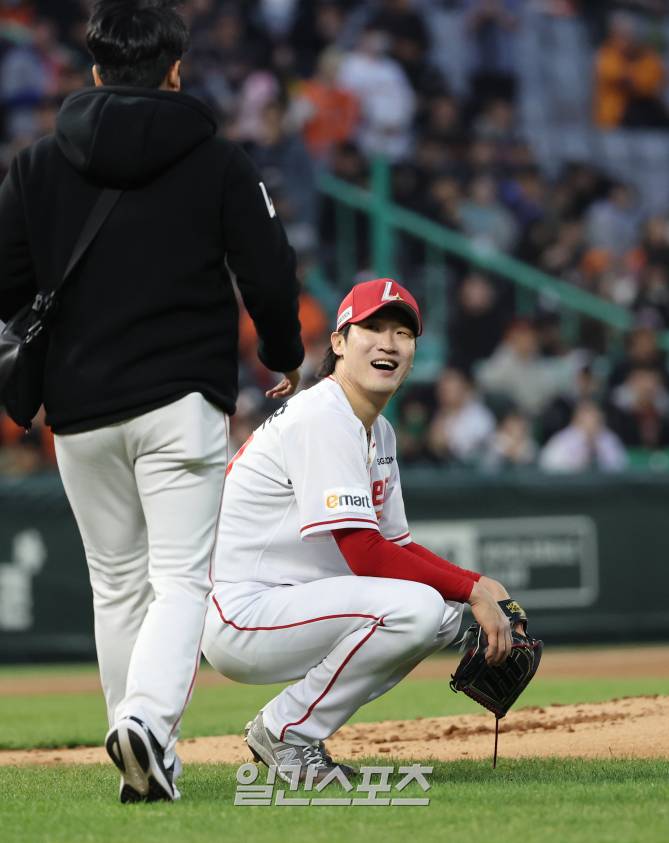 2024 프로야구 SSG 랜더스와 한화 이글스의 경기가 27일 오후 인천SSG랜더스필드에서 열렸다. 2회 초 1사 1루 임종찬의 땅볼 타구에 맞은 박종훈이 공을 잡아 타자를 아웃시킨 뒤 달려나온 트레이너를 보며 웃고 있다. 인천=김민규 기자 /2024.03.27/