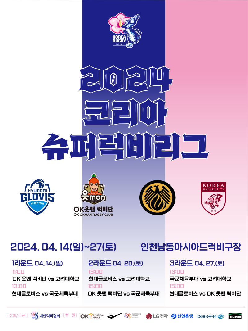 대한럭비협회(협회장 최윤)가 오는 14일부터 27일까지 14일간의 일정으로 인천 광역시 남동아시아드 경기장에서 ‘2024 코리아 슈퍼럭비리그’를 개최한다고 밝혔다.