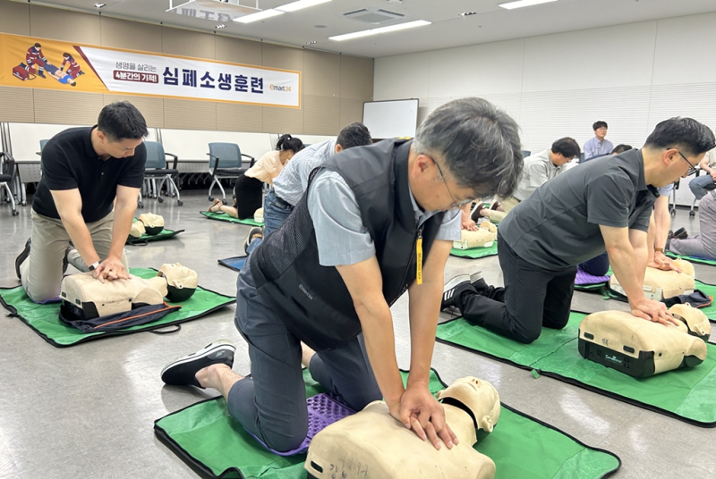 이마트24는 지난 19일부터 이날까지 본사 임직원 등 급성 심정지 환자 발생 시 신속한 응급처치 및 대응 역량 향상을 위해 본사 파트장급 이상 50명을 대상으로 교육훈련을 진행했다. 이번 훈련에는 대한심폐소생협회 소속으로 활동 중인 전문 강사들이 투입돼 교육을 진행했다.