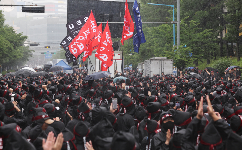 8일 우천 속에 진행된 삼성전자 최대 노조인 전국삼성전자노동조합(전삼노)의 총파업에 6000명 이상이 모인 것으로 알려졌다. 전삼노는 이날 오전 11시부터 경기 화성시 삼성전자 화성사업장 H1 정문 앞에서 총파업 결의 대회를 열었다. 지난달 연가 투쟁이 있었지만 이번이 사실상 전삼노의 첫 파업이다.