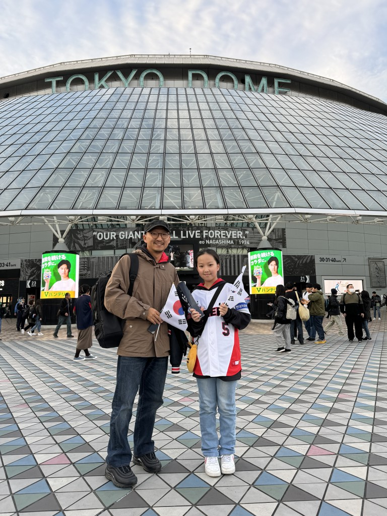 지난해 11월 아시아 프로야구 챔피언십(APBC) 대회가 열린 일본 도쿄돔 앞에서 기념 사진을 찍은 전상민·하율 부녀. 부녀는 일본 현지에서도 대표팀은 물론이고 김도영을 응원했다. 전상민 제공