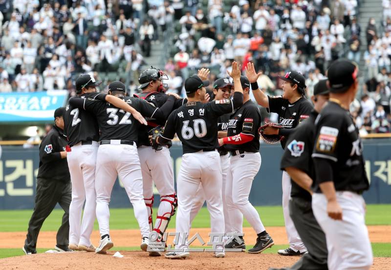 2024 프로야구 KBO 포스트시즌 두산베어스와 kt위즈의 와일드카드결정전(WC) 2차전 경기가 3일 오후 서울 잠실야구장에서 열렸다. 시리즈 2연승으로 사상 첫 업셋을 달성하며 준플레이오프에 진출을 확정한 KT선수들이 경기 종료 후 기뻐하고 있다. 잠실=김민규 기자 mgkim1@edaily.co.kr /2024.10.03/