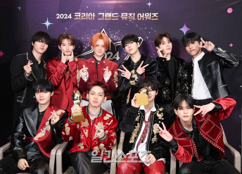 그룹 TREASURE(트레져)가 17일 인천 중구 운서동 인스파이어 아레나에서 열린 '2024 코리아그랜드뮤직어워즈(KGMA)' 둘째날 송데이에서 베스트 송, 베스트 스테이지를 수상 후 트로피를 세리머니를 하고 있다.