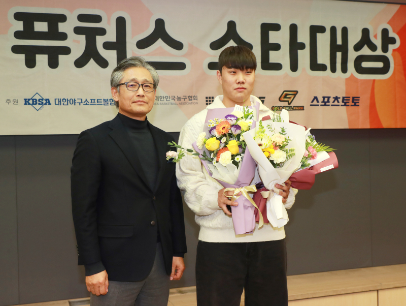 25일 오후 서울 프레스센터에서 진행된 2024 퓨처스 스타대상 시상식(주최 스타뉴스)에서 야구부문 스타상을 수상한 박준순이 양해영 대한야구소프트볼협회 부회장과 포즈를 취하고 있다.‘퓨처스 스타대상’은 한국 스포츠 발전과 아마추어 체육 활성화에 기여하고자 제정됐다. 사진=스타뉴스 제공 지난 25일 퓨처스 스타대상에서 스타상을 수상한 박준순은 시상식 후 취재진과 만난 자리에서 내야 경쟁에 거론되는 데 대해 "조금 기분 좋다. 설레는 것도 있다"며 "주위에서 제 이름을 언급해주신다는 건 기대를 많이 해주신다는 것이니 기분 좋게 생각한다"고 전했다.