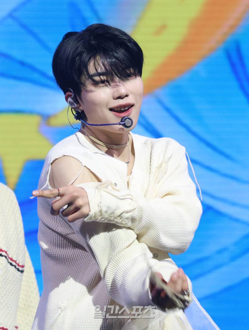 그룹 제로베이스원이 24일 오후 서울 용산구 블루스퀘어 마스터카드홀에서 열린 다섯 번째 미니 앨범 'BLUE PARADISE(블루 파라다이스)' 발매 기념 쇼케이스에서 타이틀곡 무대를 선보이고 있다.