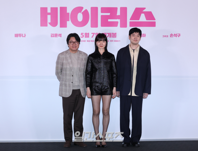 배우 김윤석, 배두나, 장기하가 28일 오후 서울 용산구 CGV용산아이파크몰에서 열린 영화 '바이러스' 언론배급시사회 및 기자간담회에 참석해 포즈를 취하고 있다.