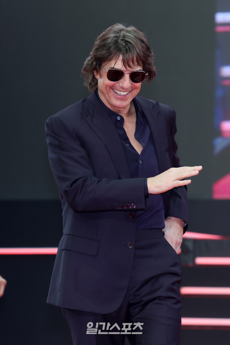 할리우드 배우 톰 크루즈가 8일 오후 서울 송파구 롯데월드 아이스링크에서 열린 영화 '미션 임파서블: 파이널 레코닝' 내한 레드카펫 행사에 참석하고 있다.