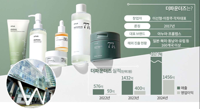 화장품 브랜드 아누아와 프롬랩스 등을 거느린 더파운더즈는 서울대 출신 동기인 이선형·이창주 각자 대표가 2017년 설립했다. 특히 아누아가 ‘순한 화장품’으로 북미 지역 이커머스 플랫폼에서 대박을 터뜨리면서 주목받기 시작했다. 지난해 더파운더즈 매출에서 아누아가 차지하는 실적은 약 4200억원에 달한다. 업계 관계자는 “인디 브랜드별 매출 기준으로 볼 때 지난해 가장 많이 판매된 브랜드가 아누아”라며 “사실상 더파운더즈 매출의 80% 이상이 아누아에서 나온다고 해도 과언이 아니다”고 귀띔했다.