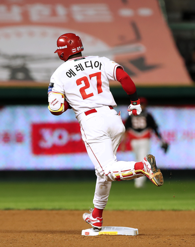 23일 인천 KIA전에서 홈런을 기록한 뒤 베이스를 도는 에레디아. SSG 제공