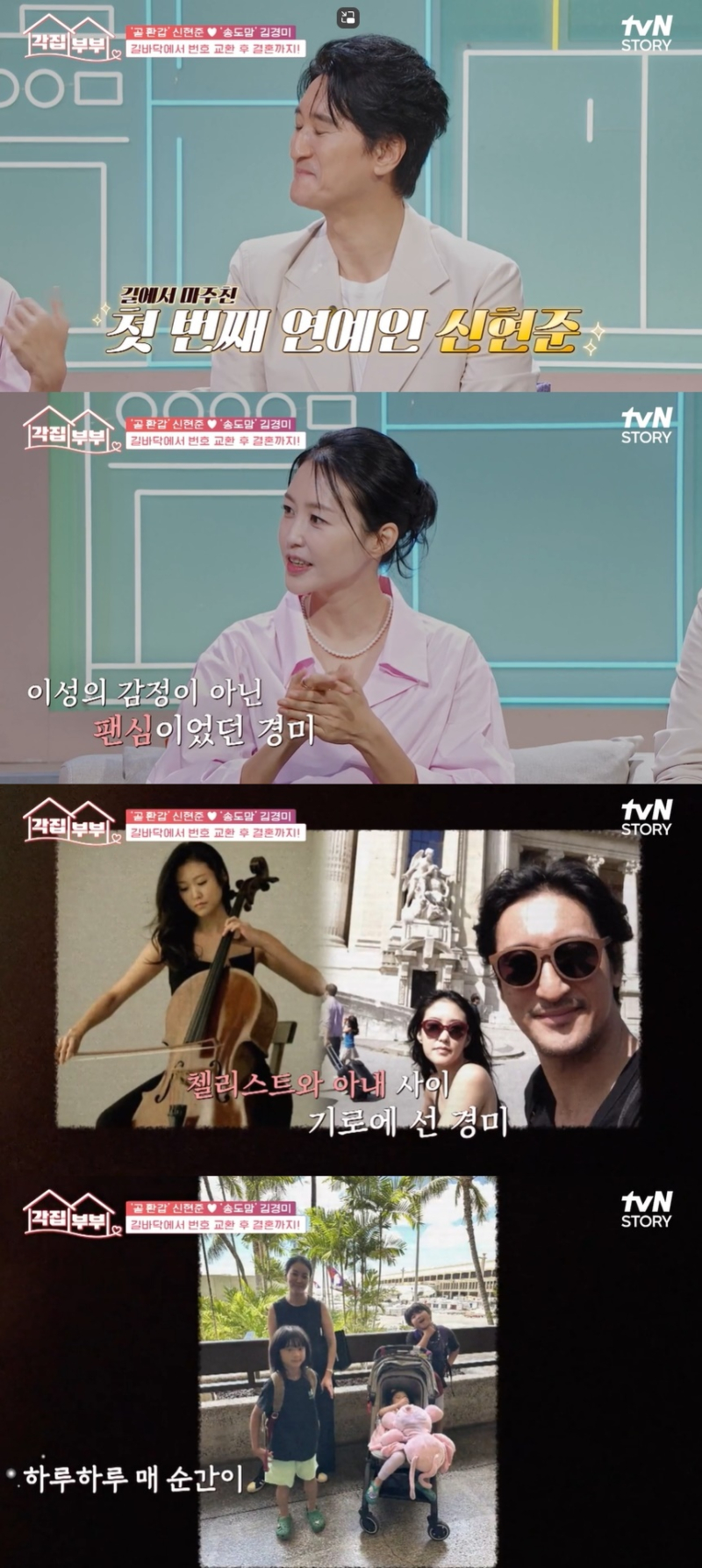 2일 방송된 tvN 스토리 ‘각집부부’에는 신현준과 첼리스트 아내 김경미의 이야기가 공개됐다. 두 사람은 추운 겨울날 길에서 우연히 마주치며 인연을 시작했다. 당시 김경미가 첼로에 사인을 요청했고, 신현준은 명함을 건네며 “놓치면 안 될 것 같다”는 마음으로 정성스레 사인과 날짜를 남겼다. 김경미는 “그 명함을 아직도 가지고 있다”며 “처음에는 팬심이었는데 점점 사랑으로 변했다”고 회상했다.