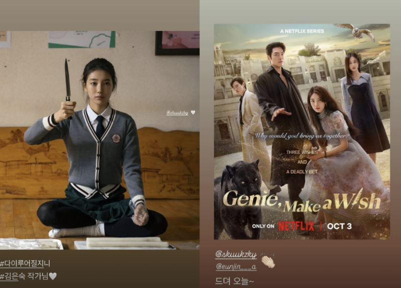 사진=송혜교 SNS 이날 총 13부작으로 공개된 ‘다 이루어질지니’는 천여 년 만에 깨어난 경력 단절 램프의 정령 지니(김우빈)가 감정 결여 인간 가영(수지)을 만나 세 가지 소원을 두고 펼치는 판타지 로맨틱 코미디다. 송혜교가 ‘태양의 후예’ ‘더 글로리’로 함께했던 김은숙 작가의 신작이다.