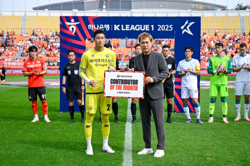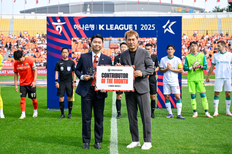 강원FC는 지난달 27일 강릉하이원아레나에서 열린 하나은행 K리그1 2025 31라운드 대전하나시티즌과 홈경기에서 8월의 공헌상 시상식을 진행했다. 지난해 신설된 이달의 공헌상은 묵묵히 구단 발전에 공헌한 ‘언성 히어로’를 선수단과 프런트에서 1명씩 선정한다. 수상자에게는 트로피와 상품권을 선물한다.